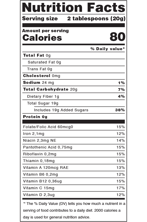 Sugar, transgenic corn starch (Bacillus thuringiensis, Streptomyces viridochromogenes, Agrobacterium tumefaciens), salt, anti-caking agent silicon dioxide, vitamins (A, B1, B2, B3, B5, B6, B9, B12, C and D), mineral iron, aroma identical to natural fruit vitamin and artificial colors tartrazine and yellow