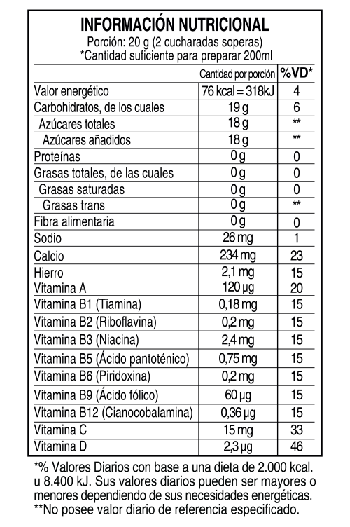 Azúcar, cacao en polvo, maicena (Bacillus thuringiensis, Streptomyces viridochromogenes, Agrobacterium tumefaciens), minerales (carbonato de calcio (calcio) y sulfato ferroso (hierro)), jugo de fresa deshidratado, maltodextrina, sal, vitaminas (A, B1, B2, B3, B5, B6, B9, B12, C y D), antiaglomerante dióxido de silicio, sabor natural a fresa y colorante artificial rojo Allura AC.