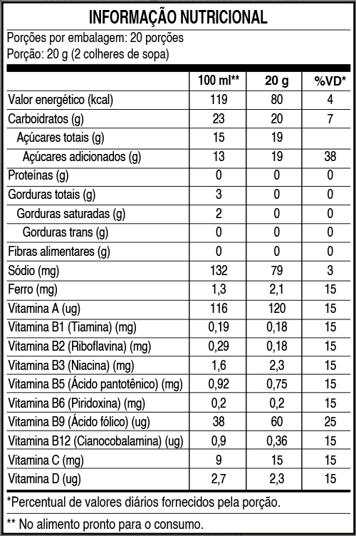 Açúcar, cacau em pó, sal, vitaminas (A, B1, B2, B3, B5, B6, B9, B12, C e D), mineral ferro, aroma idêntico ao natural de morango e baunilha e emulsificante lecitina de soja.