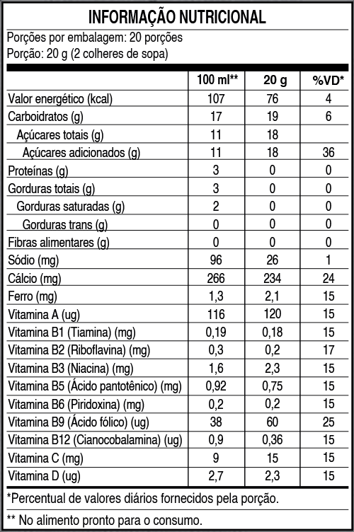 Açúcar, maltodextrina, amido de milho (Bacillus thuringiensis, Streptomyces viridochromogenes, Agrobacterium tumefaciens), sal, antiumectante dióxido de silício, vitaminas (A, B1, B2, B3, B5, B6, B9, B12, C e D), mineral ferro, aroma idêntico ao natural de morango e corante artificial vermelho 40.