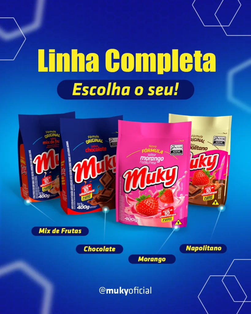 Fala sério, tem coisa melhor do que abrir o armário e encontrar aquele pacote de Muky te esperando? Agora imagina poder escolher entre 4 sabores diferentes, um pra cada dia. É isso que a linha completa de Muky oferece: variedade e muuuito sabor!