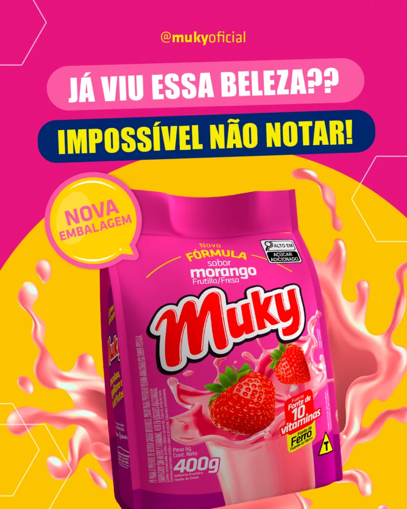 A ideia foi deixar Muky Morango ainda mais fácil de achar na prateleira e, claro, destacar toda a personalidade desse sabor queridinho. Porque vamos combinar: se é pra tomar Muky, que seja com muito charme e presença, né?