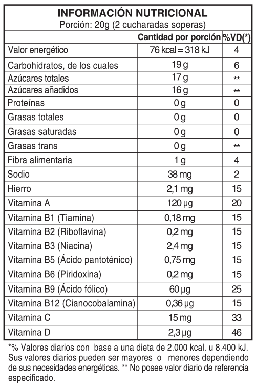 Azúcar, cacao en polvo, maicena (Bacillus thuringiensis, Streptomyces viridochromogenes, Agrobacterium tumefaciens), maltodextrina, sal, vitaminas (A, B1, B2, B3, B5, B6, B9, B12, C y D), mineral (hierro), sabor artificial a vainilla y emulgente lecitina de soya.